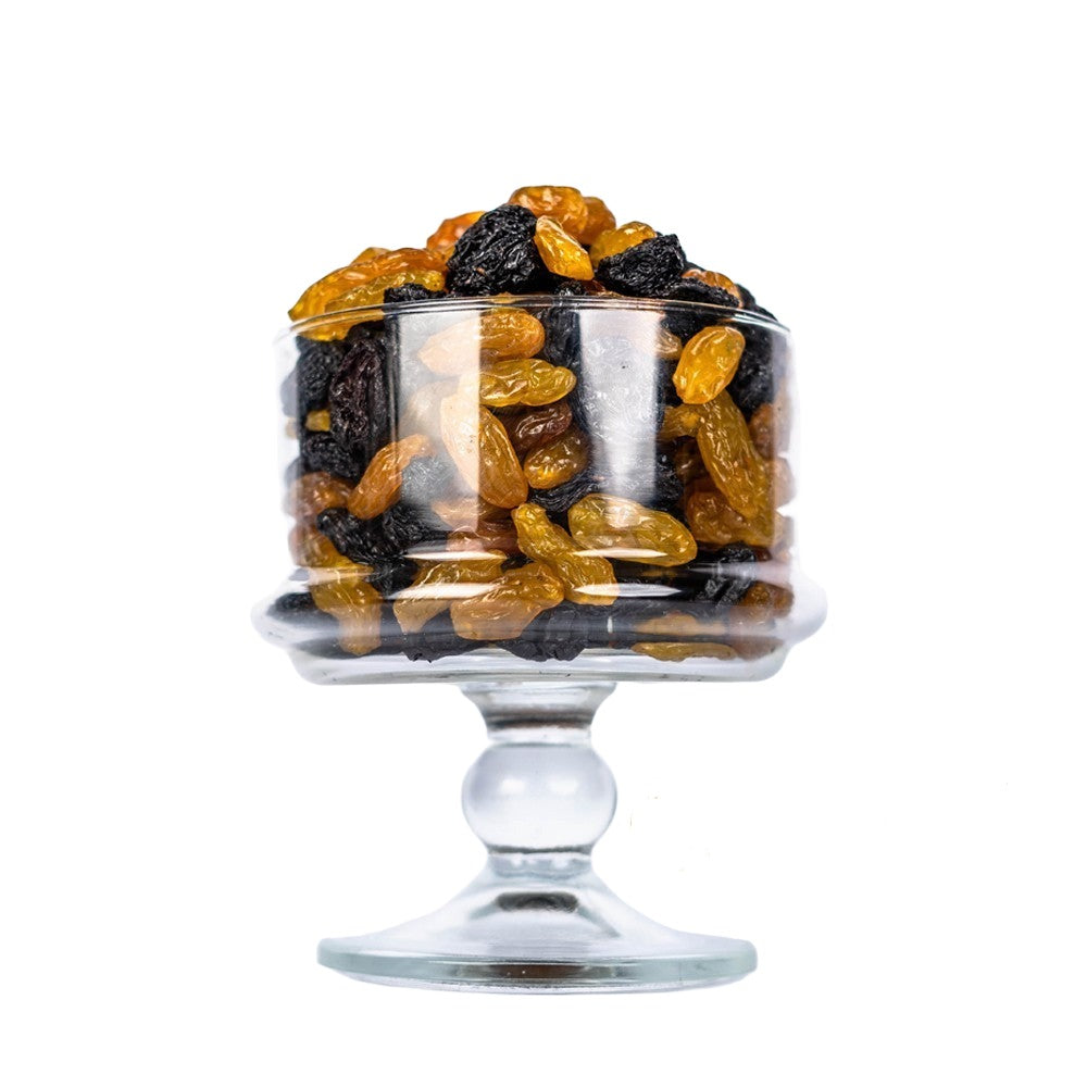The mix of size raisins is ripened by the sun, then dried, carefully moisturized, and packed to lock in the natural goodness. The mix of jumbo raisins is made of a combination of black jumbo raisins & golden jumbo raisins. One of the biggest benefits of eating raisins is that they're a quick, easy, and tasty way to get some of your daily recommended fruit servings. Women should eat at least 1.5 cups of fruit daily and men should have 2 cups.